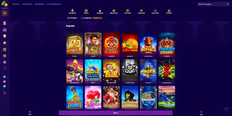 לובי המשחקים כולל מסנני מיון כמו משחקים חדשים, משחקים חמים ופופולריים, המאפשרים למצוא במהירות כותרים בולטים. בנוסף, קיימים מסננים לפי נושאים כגון חיות, ממתקים, משחקים עונתיים ואוספים ממותגים, המספקים דרכים נוספות לחקור את קטלוג הסלוטים.