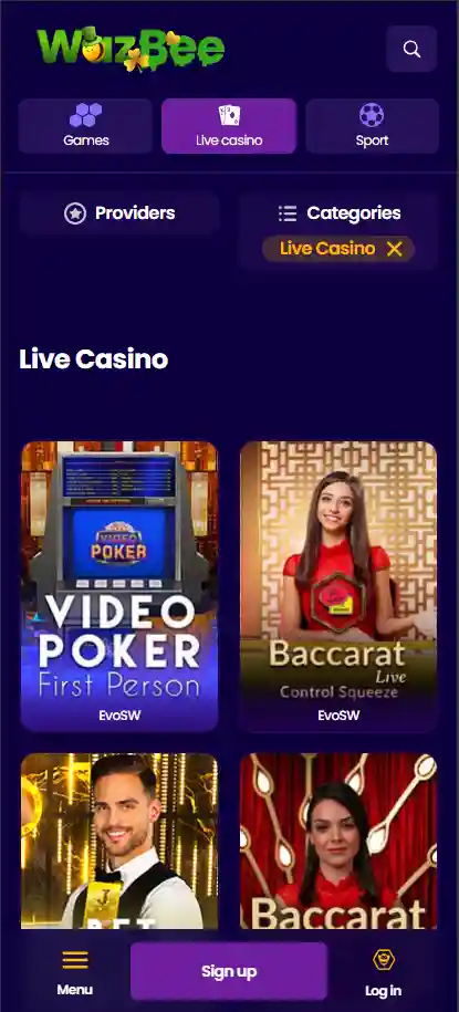 Wazbee מציע קטגוריית קזינו לייב מקיפה הכוללת למעלה מ-400 משחקי דילר חי. ההיצע מופעל על ידי מספר ספקי לייב מוכרים, כולל Evolution, Pragmatic Play Live, Ezugi ו-Amusnet.